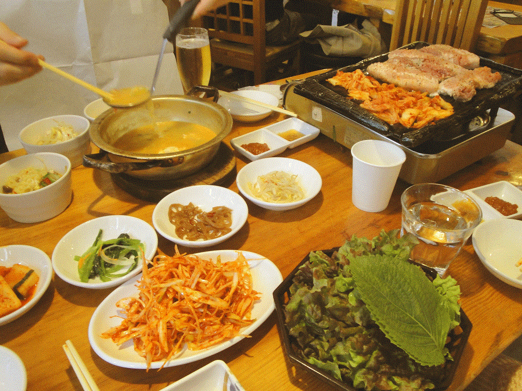 And we ate Samgyeopsal.It's popular Korean dish which is baked pork with kimuchi and vegetables.