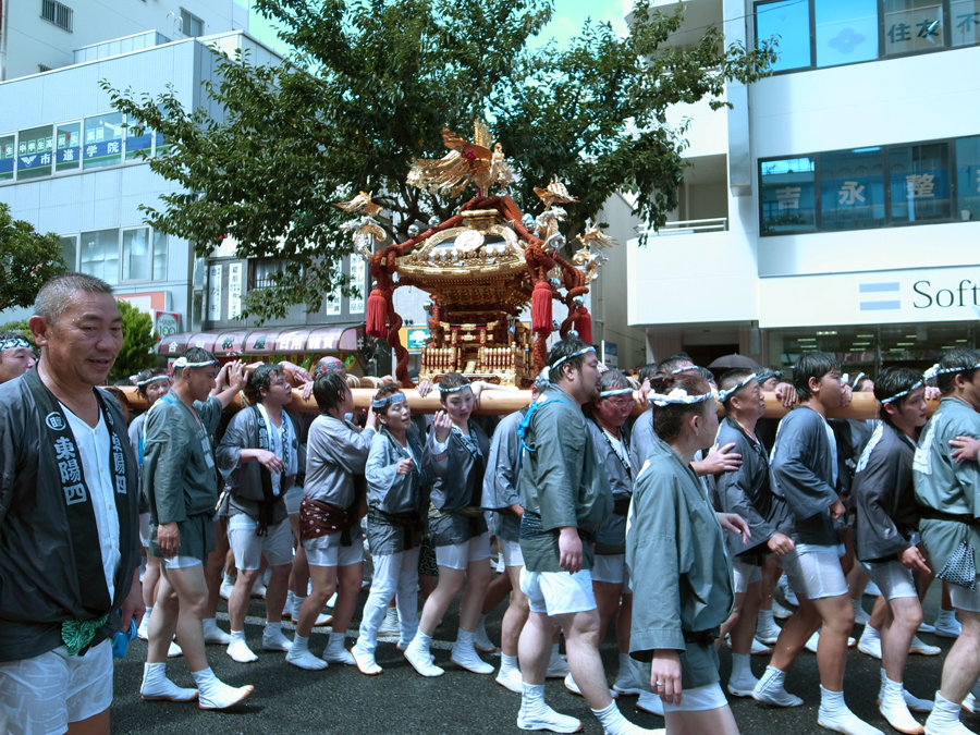 People carries mobile mini shrine,called "mikoshi",with calling out "Wasshoi!Wasshoi!".